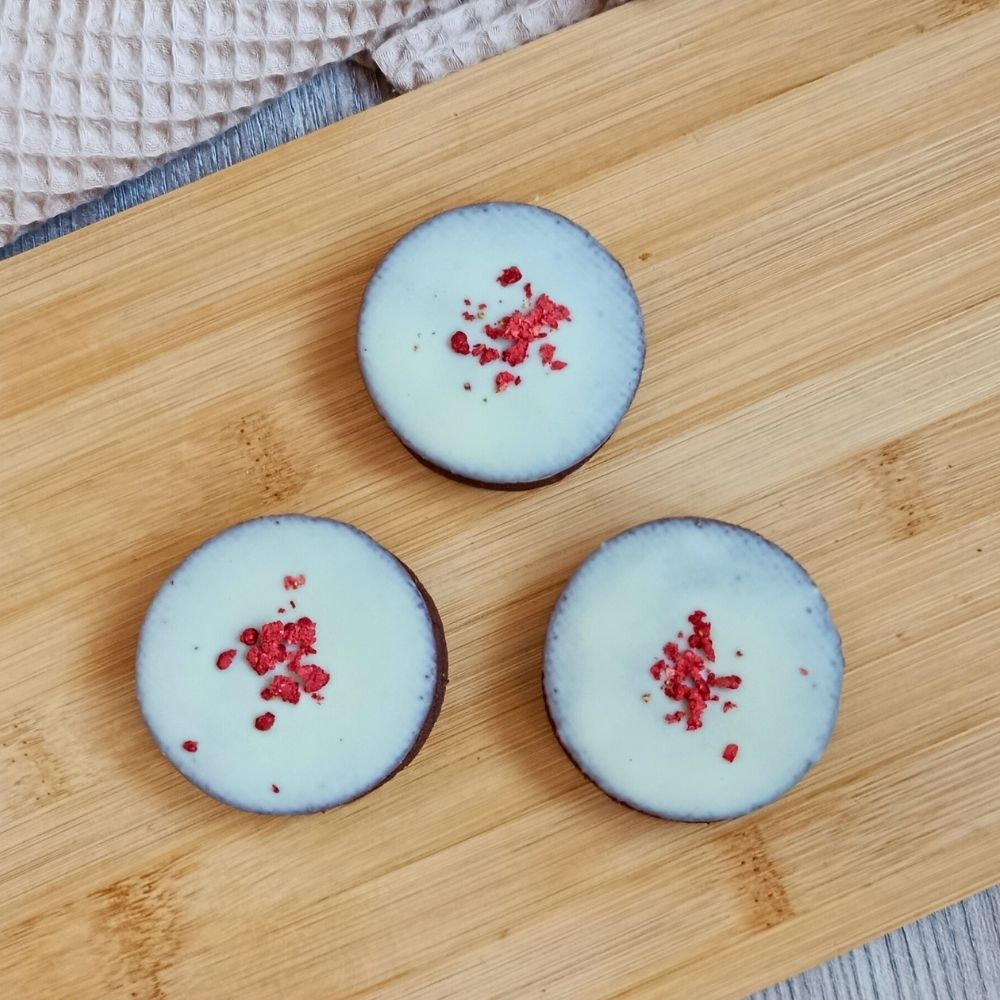 Celý dezert je namočený do bílé čokolády, která dodává jemnost a elegantní vzhled. Ozdoba z mrazem sušeného ovoce podtrhuje ovocný charakter.