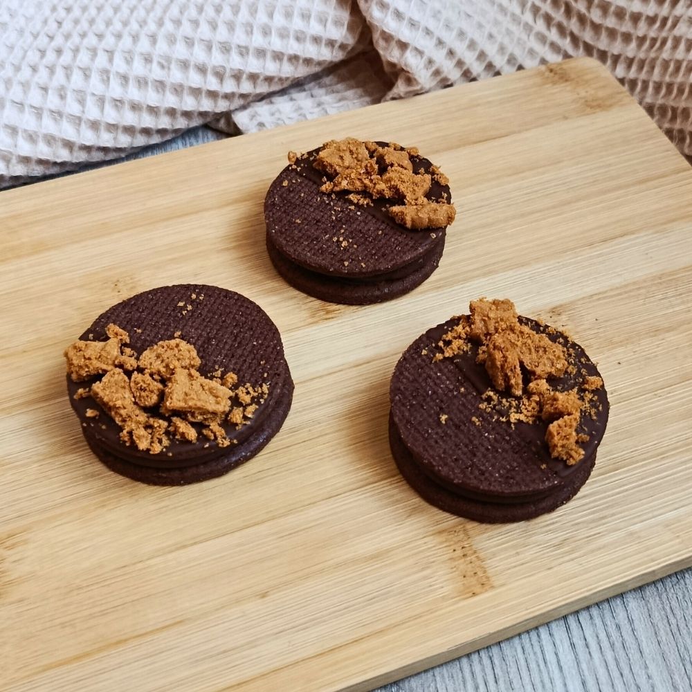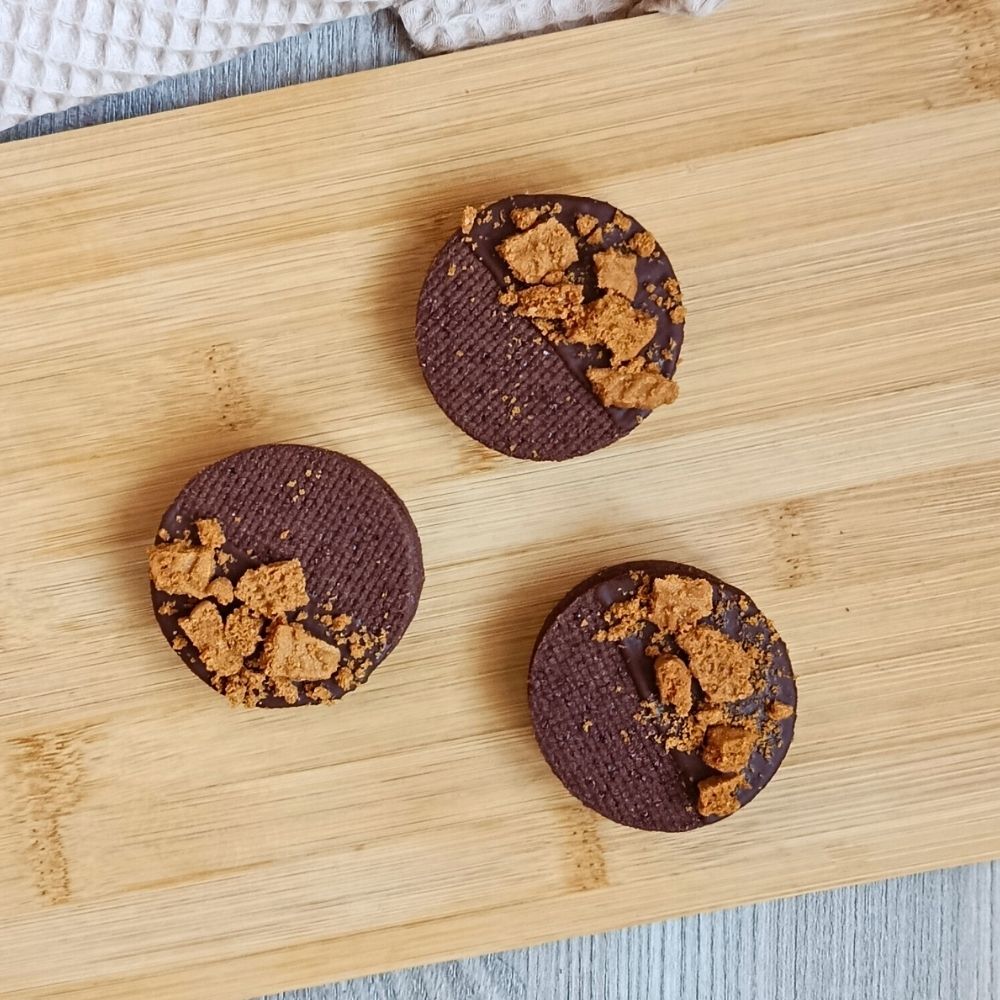 Sušenka je částečně namočená do čokolády a posypaná nadrcenými Lotus sušenkami, které dodávají křupavost i výrazný vzhled.