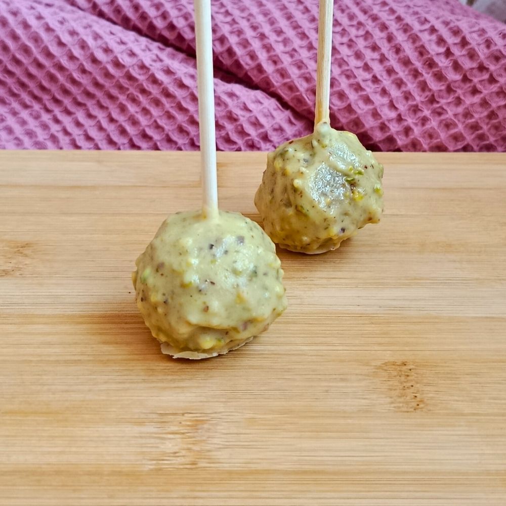 Celý cake pop je namočený do bílé čokolády, do které jsou přidány nasekané pistácie. Ideální jako sladké pohoštění na oslavy, svatby, dětské párty nebo jako drobný dezert ke kávě.