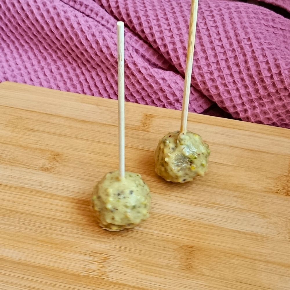 Cake pop z piškotového korpusu a mascarpone, namočený v bílé čokoládě s pistáciemi.