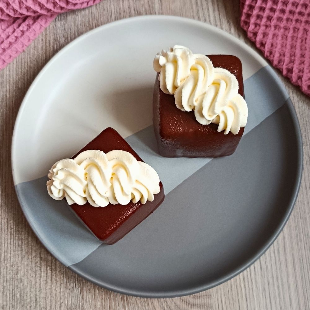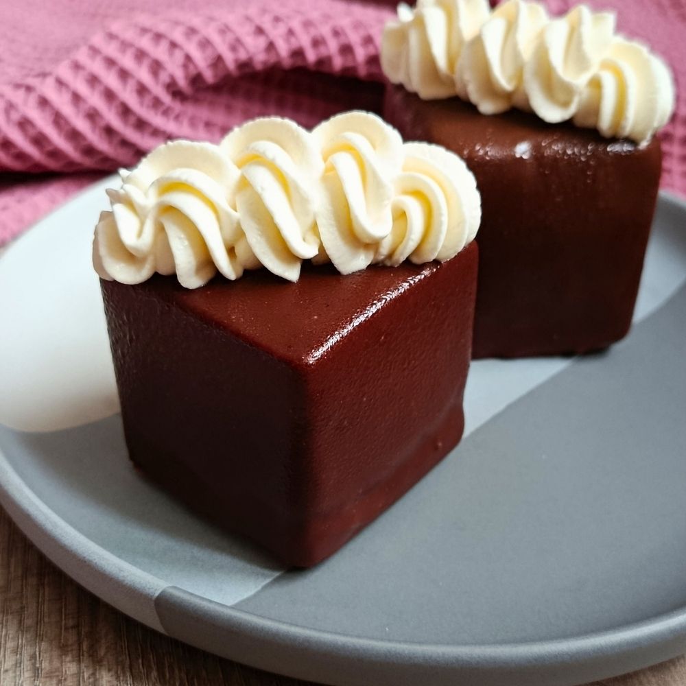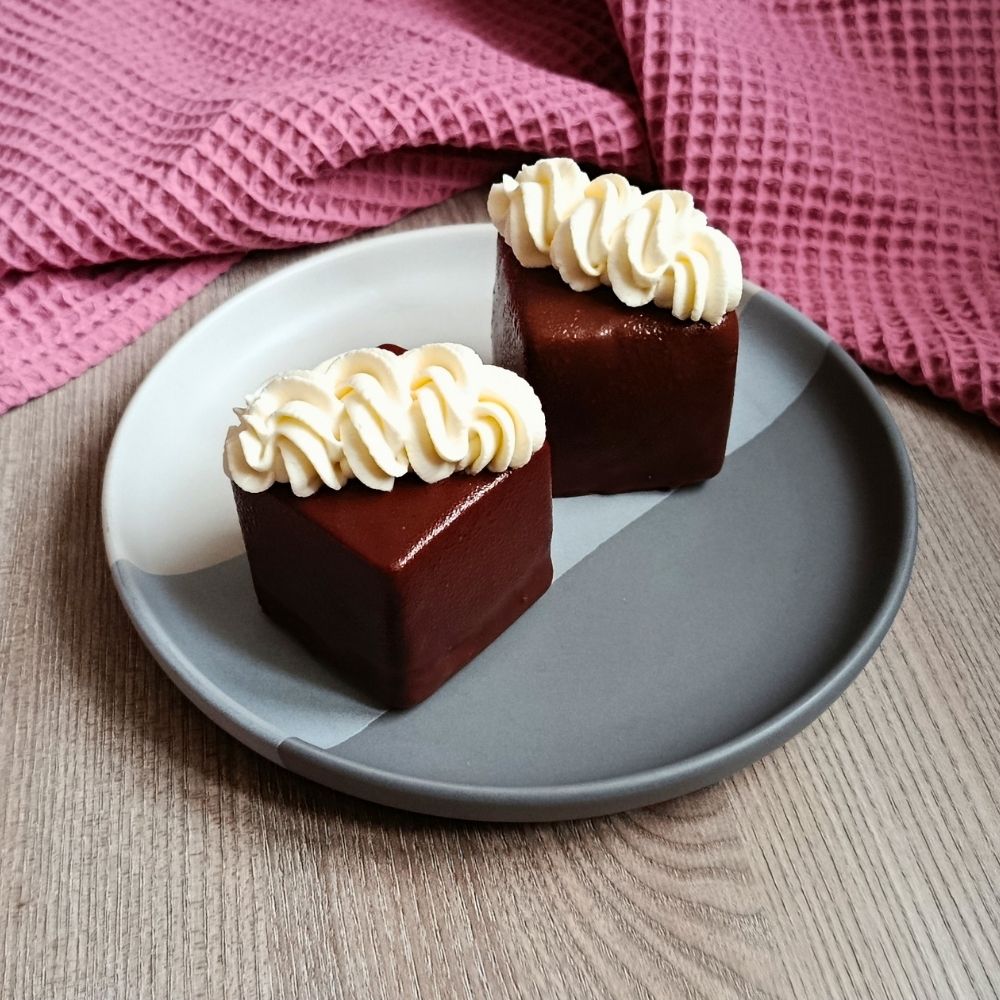 Oproti klasice je tento dortík obohacený o nadýchanou pěnu z bílé čokolády, která mu dodává jemnost a moderní nádech. Celý dezert je poté namočený do kvalitní hořké čokolády, která vytváří tenkou vrstvu.