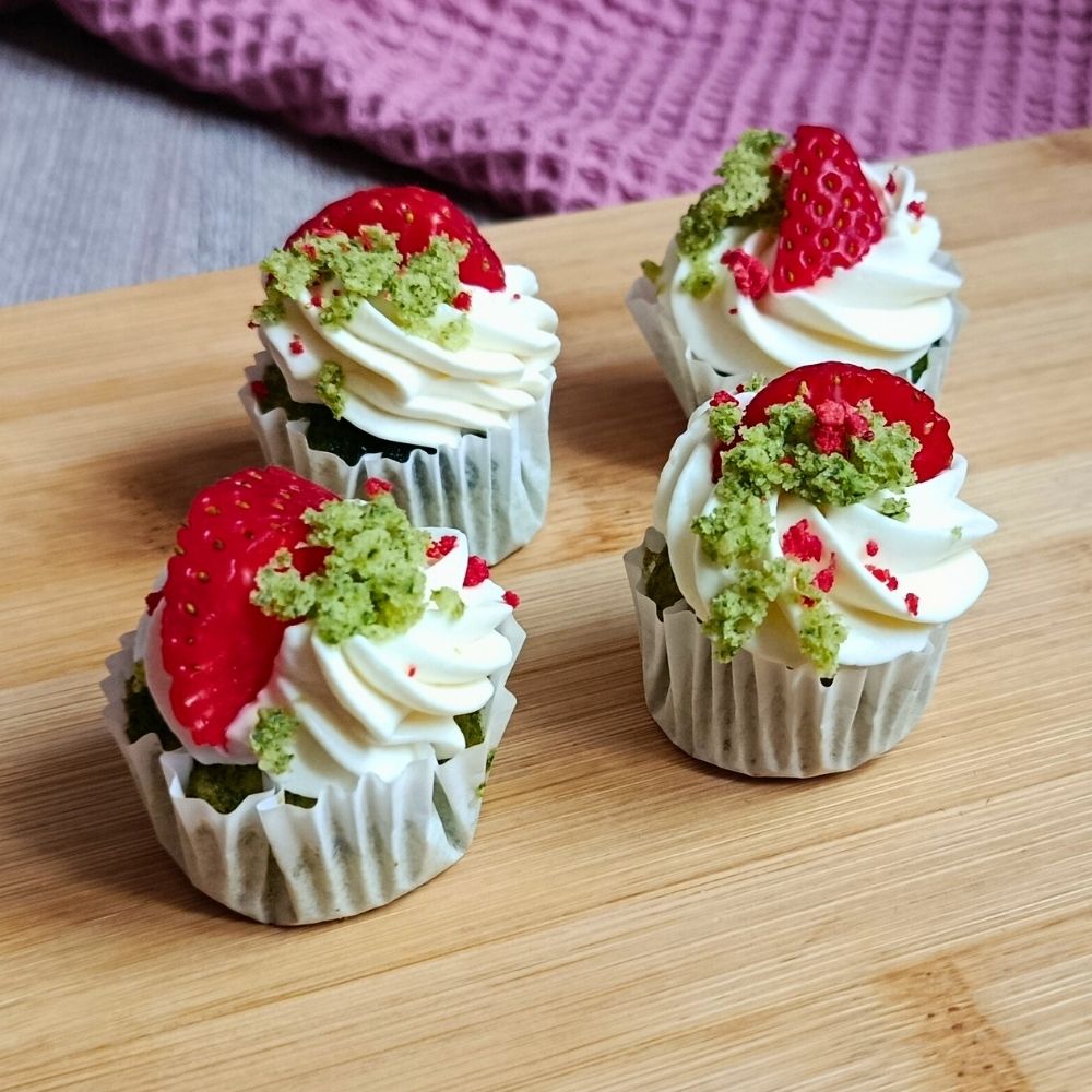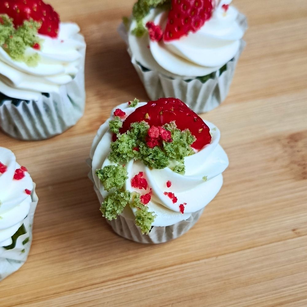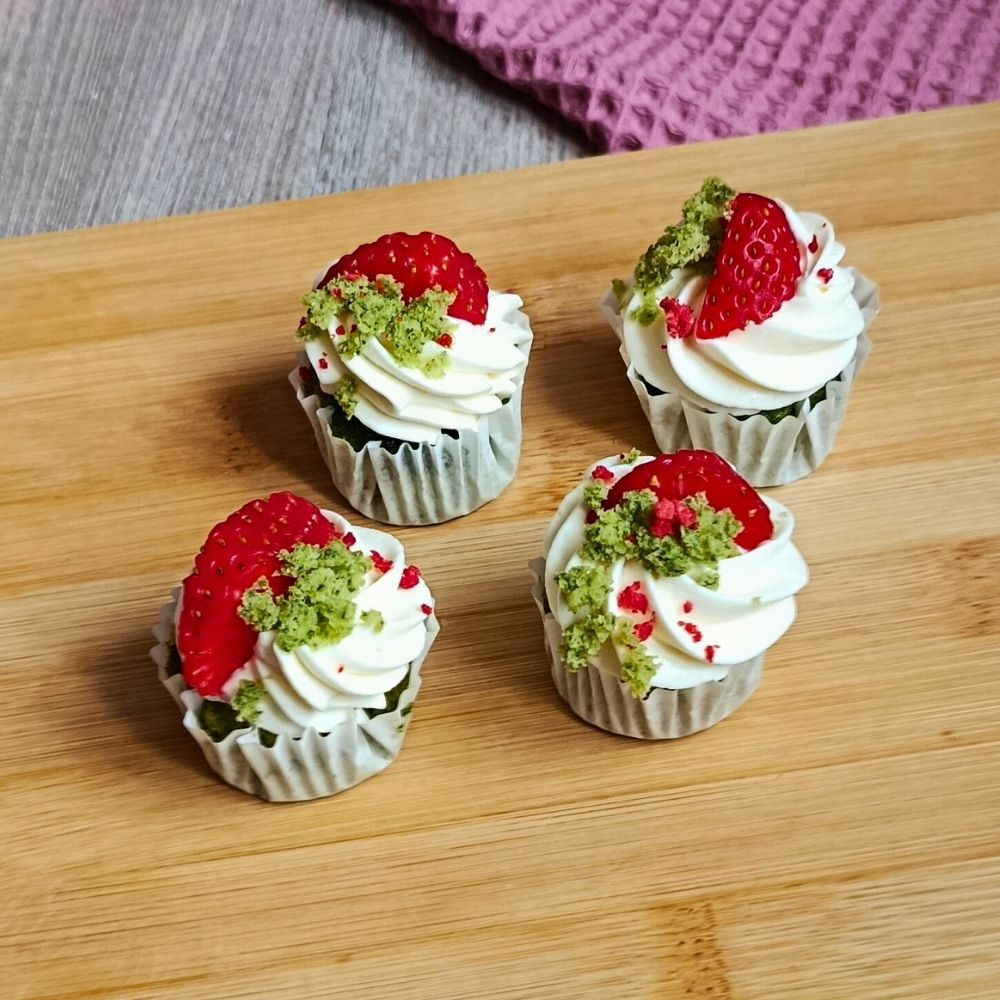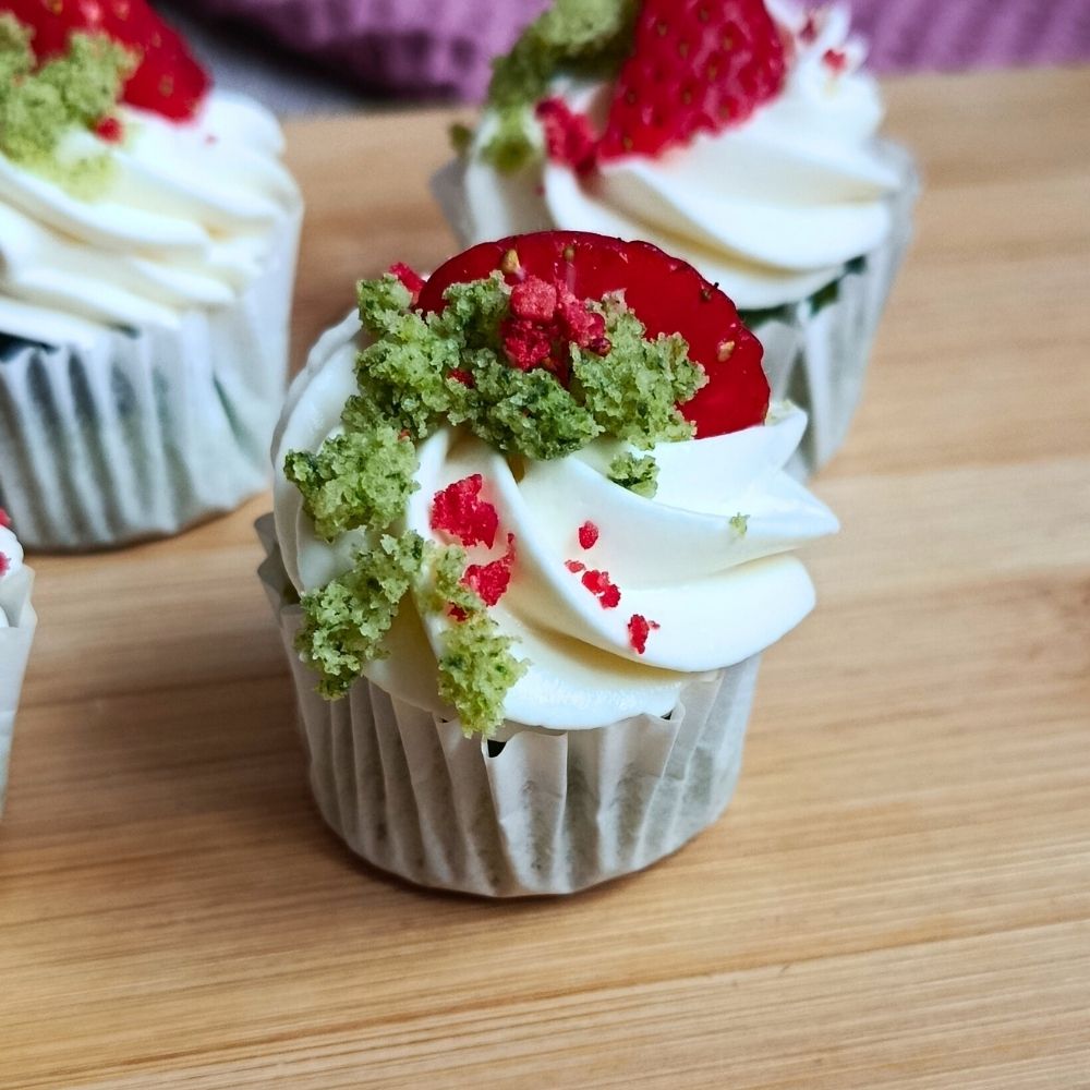 Vláčný mini mechový cupcake – lehce zelený dezert díky použití špenátu, který mu dodává nejen krásnou barvu, ale i jemnou, svěží chuť. Uvnitř každého cupcake se skrývá sladká malinová náplň, která perfektně doplňuje jemný mascarpone krém. Dezert je zakončený čerstvým ovocem, které mu dodává svěžest a atraktivní vzhled.