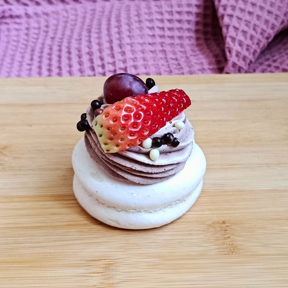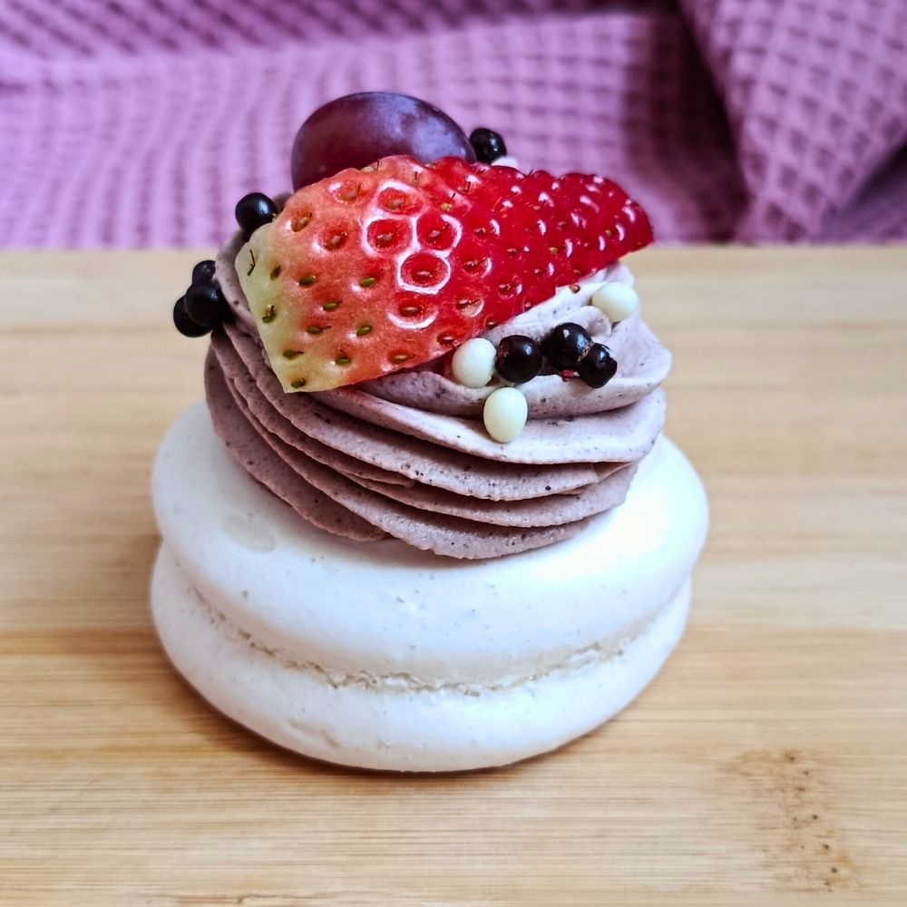 Složení: korpus: cukr, bílky, kukuřičný škrob, citronová šťáva; náplň: smetana, čokoláda hořká; krém: mascarpone, šlehačka, čokoláda hořká; zdobení: čerstvé ovoce a čokoládové kuličky
