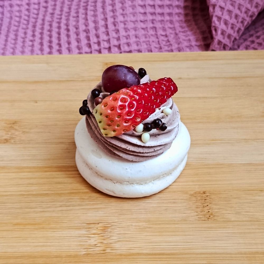 Mini Pavlova je ozdobená čerstvým ovocem, které přidává lehkou svěžest a kontrast k výrazné čokoládě.