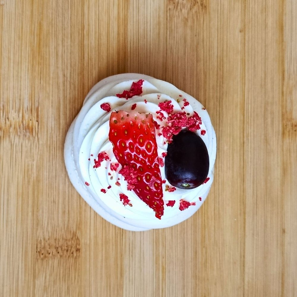 Mini Pavlova je zdobená čerstvým ovocem, které podtrhuje její lehkost, barevnost a svěží charakter.