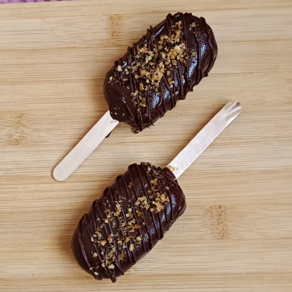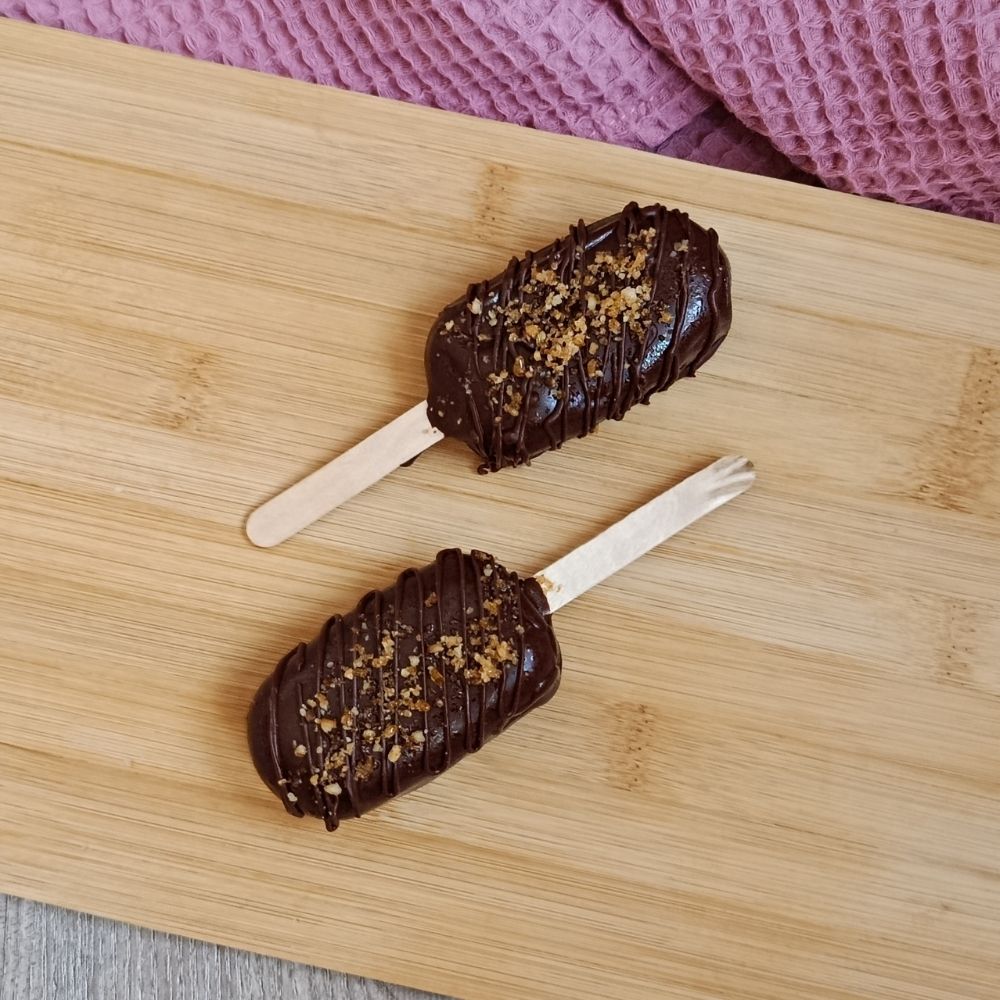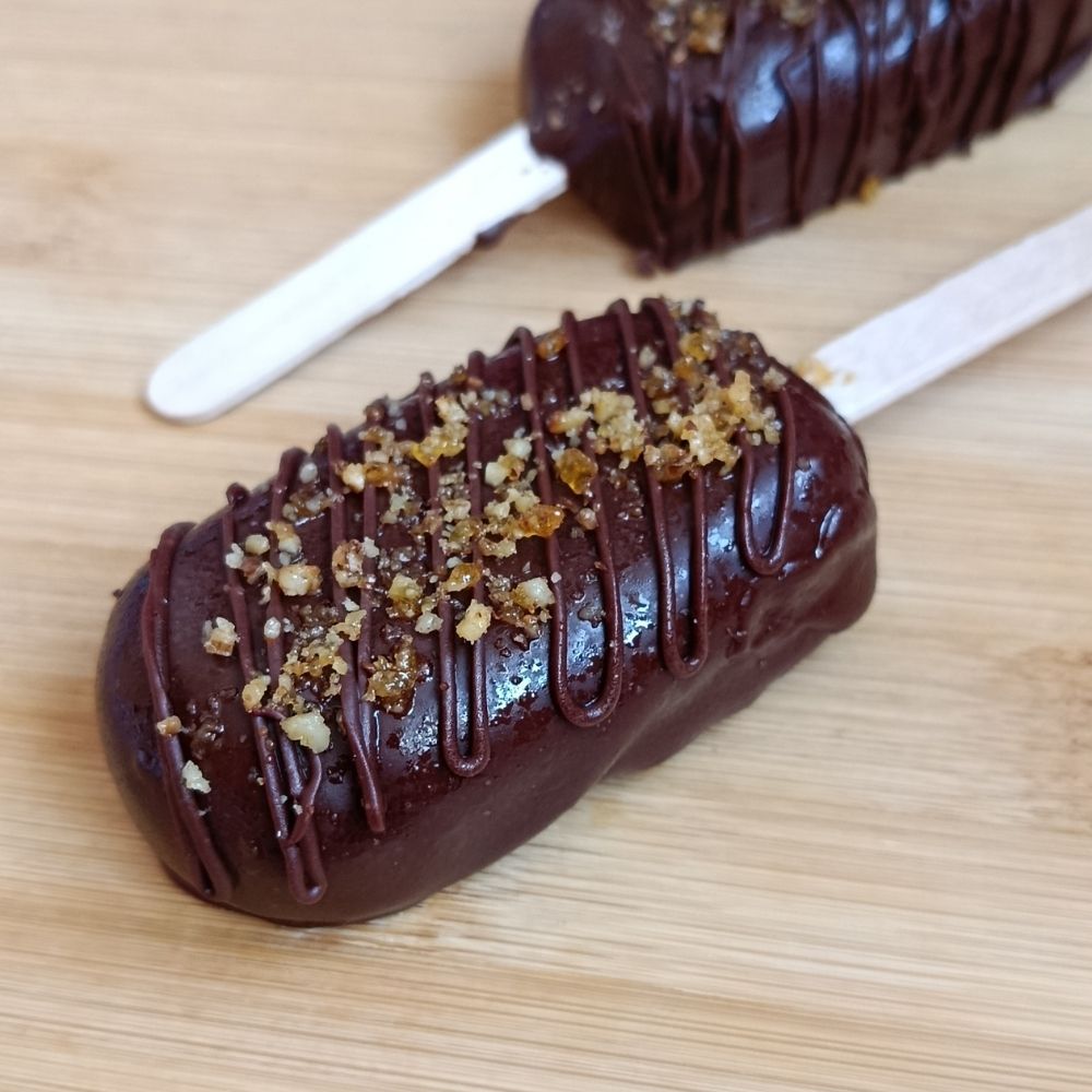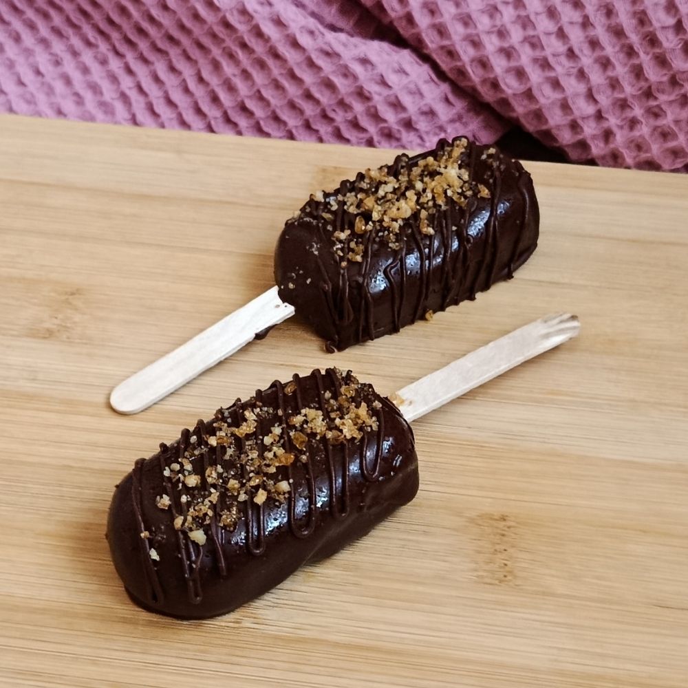 Celý nanuk je namočený v mléčné čokoládě a posypaný griliášem z vlašských ořechů, který dodává dezertu výraznější chuť i zajímavou strukturu.