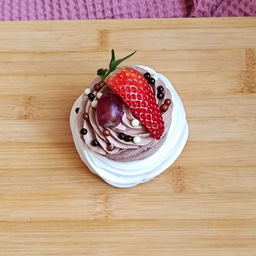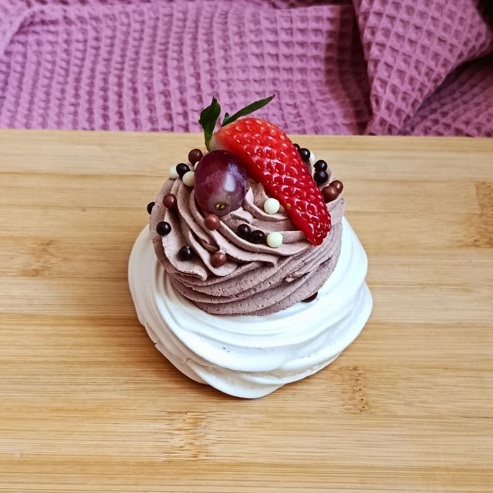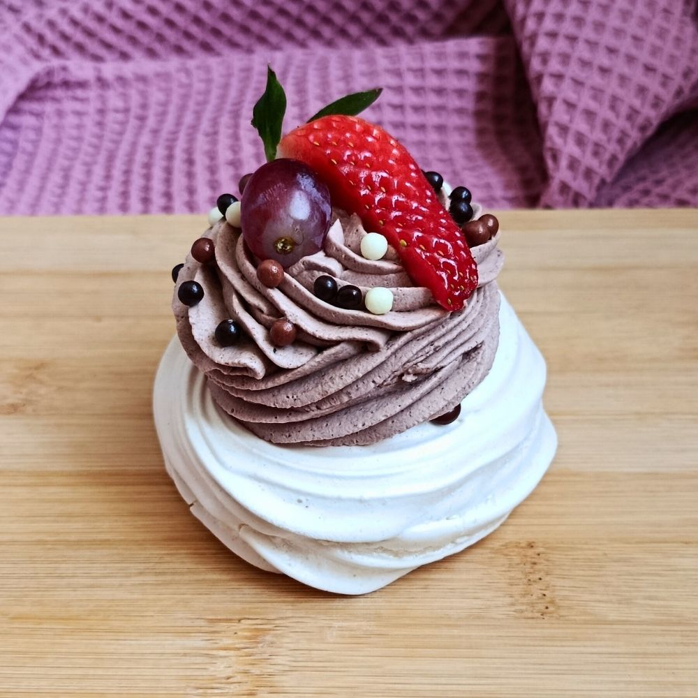 Pavlova je ozdobená čerstvým ovocem, které přidává lehkou svěžest a kontrast k výrazné čokoládě.