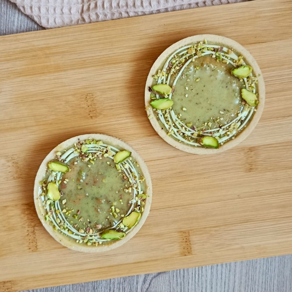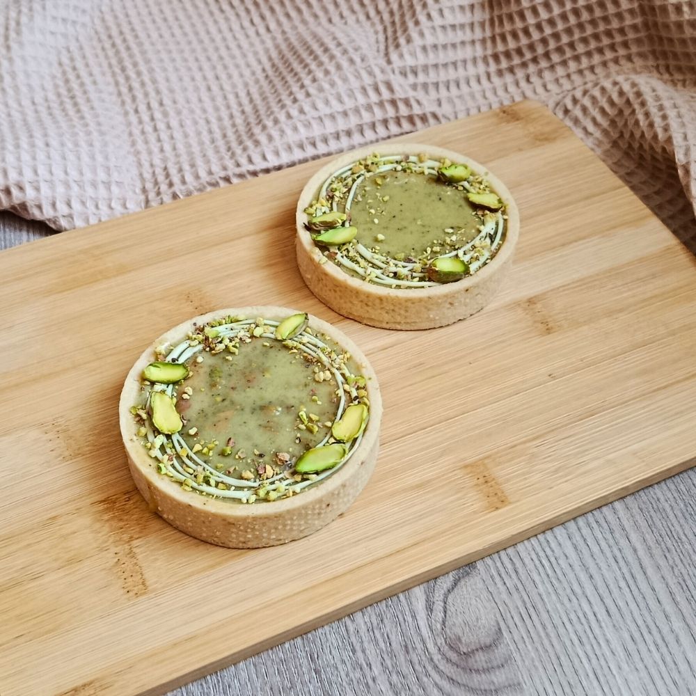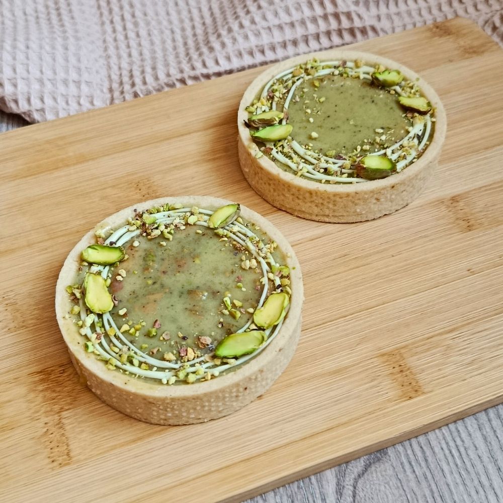 Elegantní pistáciová tartaletka ukrývá dokonale vyváženou kombinaci chutí i struktur. Uvnitř najdete jemný světlý korpus, který doplňuje křupavá pistáciová vrstva pro příjemný kontrast.