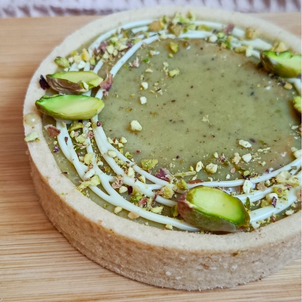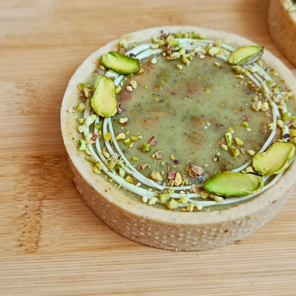 Tartaletka je ozdobená pistáciemi, které podtrhují její charakter i elegantní vzhled. Ideální jako luxusní dezert ke kávě nebo pro slavnostní příležitosti.