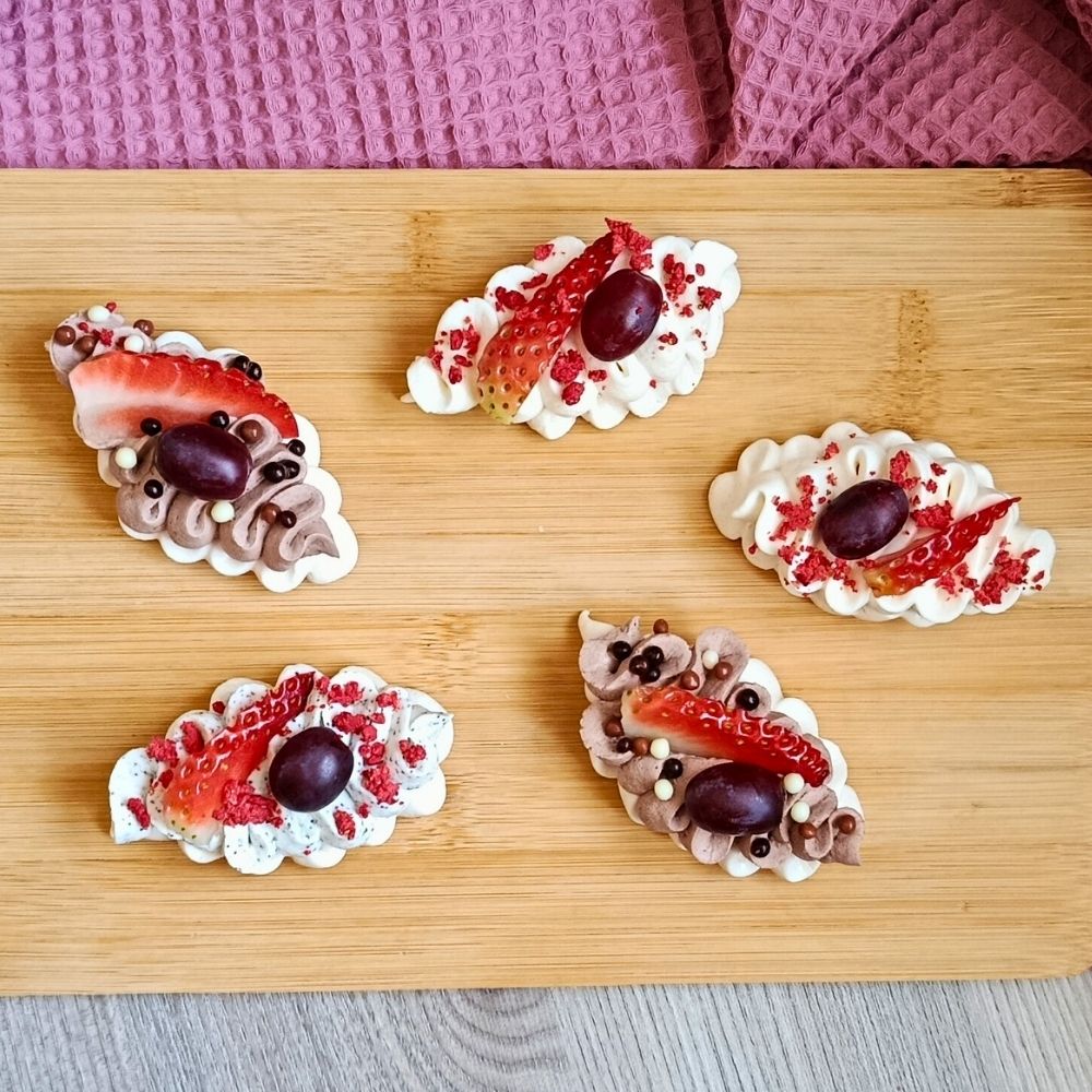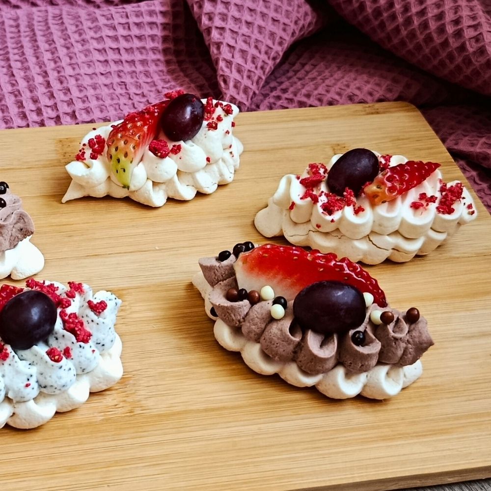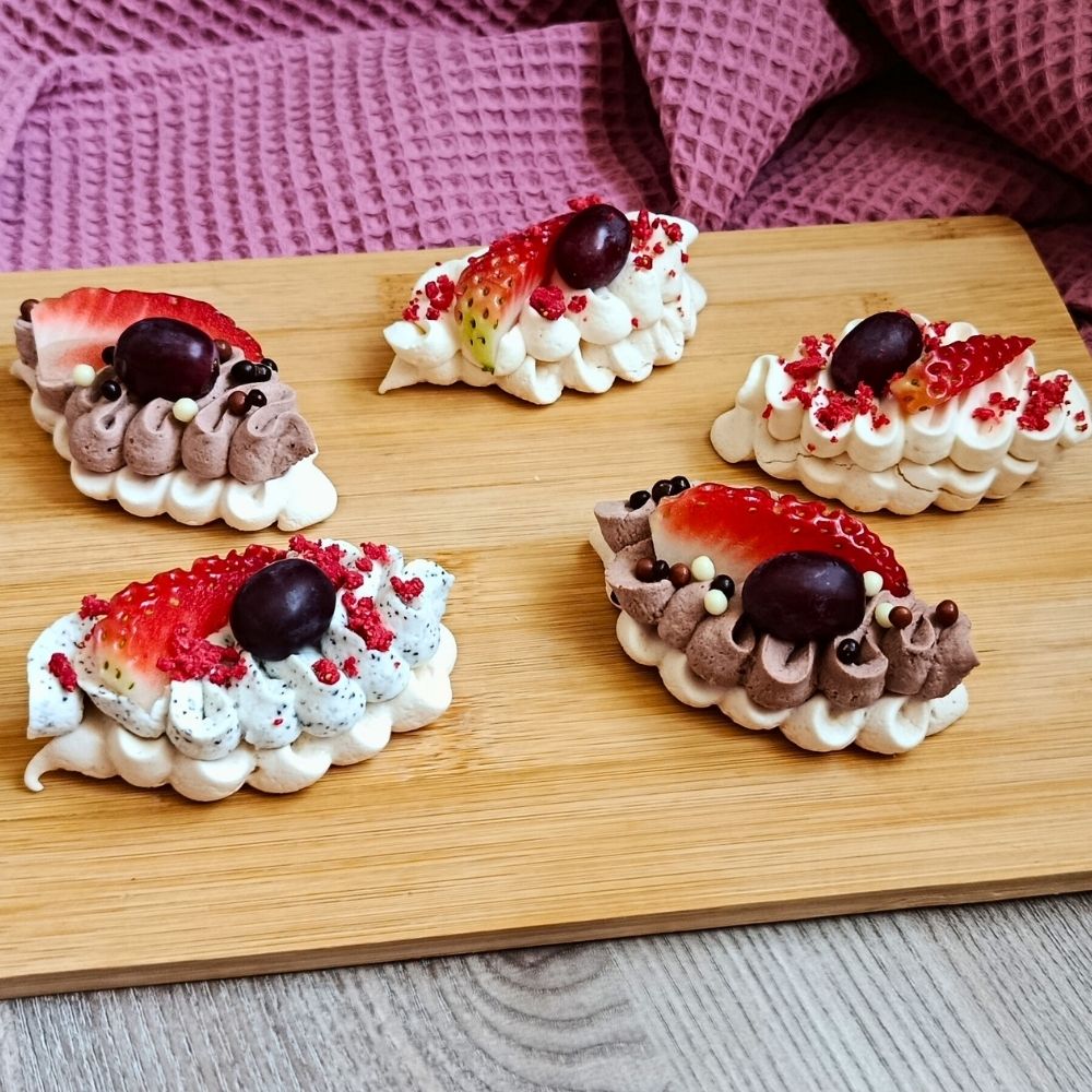 Složení: korpus: cukr, bílky, kukuřičný škrob, citronová šťáva; krém: mascarpone, šlehačka + další suroviny dle výběru (cukr, mák, káva, čokoláda hořká, ruby čokoláda, malinové pyré (malina 90 %, cukr), 100% pistáciové máslo, karamelová čokoláda); zdobení: čerstvé ovoce, ovoce sušené mrazem, pistácie, čokoládové kuličky/kávové zrno
